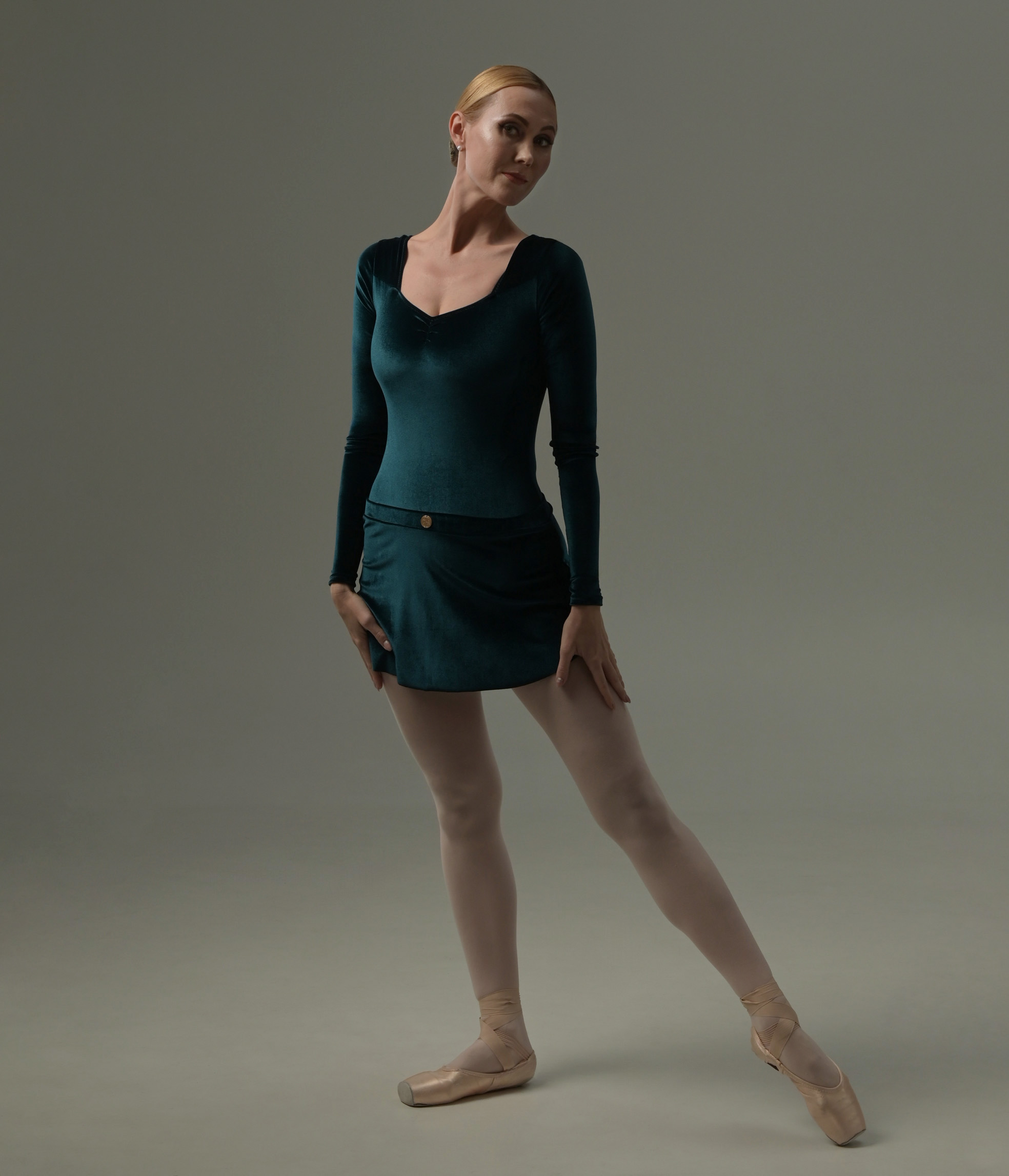 Make a statement with our Deep Teal Velvet Ballet Skirt. This jewel-toned masterpiece offers a stunning saturation that enhances your presence on stage or in the classroom. The unique texture of our luxury sports velvet provides a shimmering depth that highlights every line of your leg and hip.