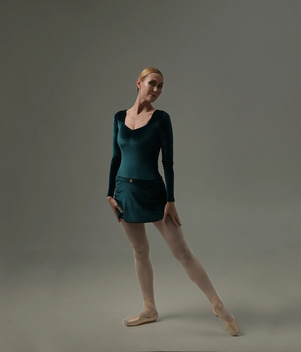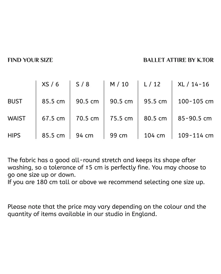 Complete your ballet look with this luxurious velvet ballet skirt, designed to complement your favourite leotards. Made in richly saturated, sophisticated shades, it offers a unique depth of colour that enhances your dancewear wardrobe. A subtle metallic label adds a touch of modern elegance. The wide elastic waistband sits gently on the hips without pressure, elongating the silhouette for a graceful line. Cut slightly longer at the back, the skirt drapes beautifully over the seat, creating an elegant and refined finish with every movement. Perfect for rehearsals, classes, or stage, this velvet ballet skirt combines comfort, style, and timeless sophistication. Please note that the price may vary depending on the colour and the quantity of items available in our studio in England. Also, due to the nature of the fabric — it’s a super-stretch sports material — you may choose to go one size up or down.